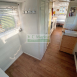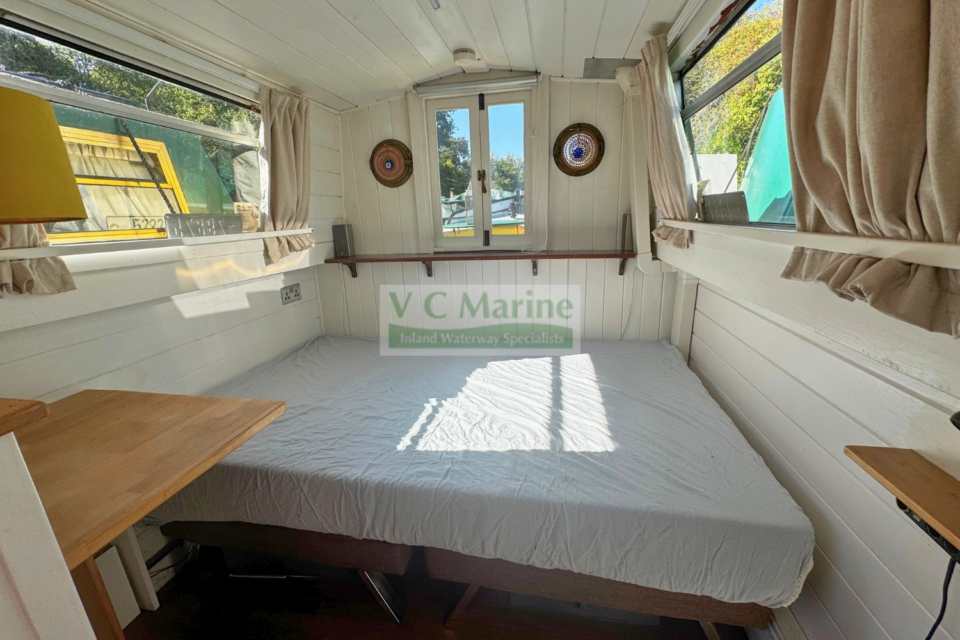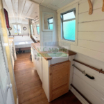 Built in 1980. Fitted by William Baisley. BMC 1.5 30hp diesel engine. 2 berth – fixed double. Solid fuel stove with back boiler heating one radiator. Compost toilet.